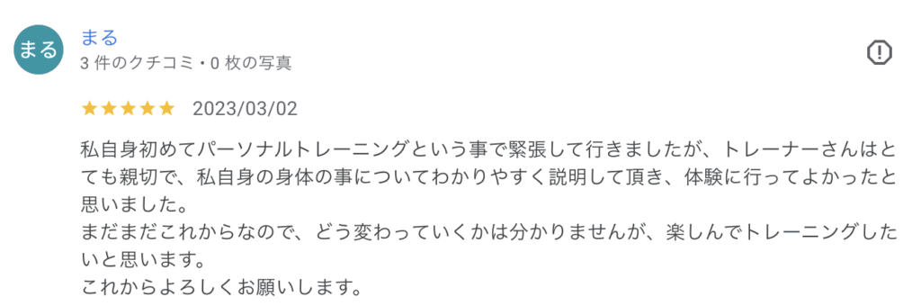 私自身初めてパーソナルトレーニングという事で緊張して行きましたが、トレーナーさんはとても親切で、私自身の身体の事についてわかりやすく説明して頂き、体験に行ってよかったと思いました。