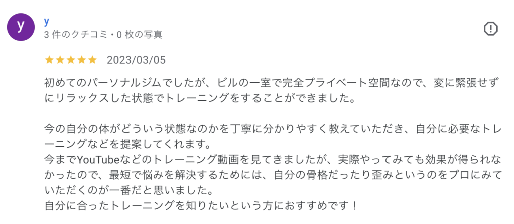 今までYouTubeなどのトレーニング動画を見てきましたが、実際やってみても効果が得られなかったので、最短で悩みを解決するためには、自分の骨格だったり歪みというのをプロにみていただくのが一番だと思いました。