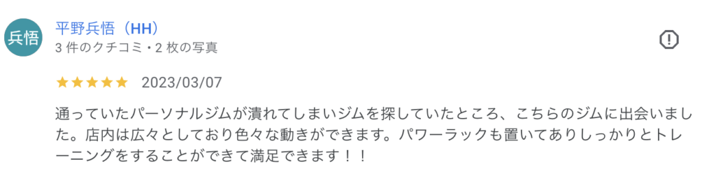 2026.02.03 店内は広々としており色々な動きができます。平野兵悟様 口コミ 通っていたパーソナルジムが潰れてしまいジムを探していたところ、こちらのジムに出会いました。店内は広々としており色々な動きができます。パワーラックも置いてありしっかりとトレーニングをすることができて満足できます!! 平野兵悟様より 執筆者:sho.yamazaki TOPページ 口コミ 関連記事 2026.01.31 とっても楽しくトレーニングをさせてもらっています。TM様 2026.02.03 バンドなどもあるのでお尻なども鍛えられて自分にとっては最高でした。y k様 2026.02.03 骨盤矯正とトレーニングがセットになっていてとても満足する事が出来ました。takafumi様 2026.02.01 このジムは個人的に本当に続けられる!と想えるおすすめジムです。広沢忍様 2026.02.02 自分に合ったトレーニングを知りたいという方におすすめです!y様 2026.02.02 50代の私にとってパーソナルトレーニングが初めての体験でしたが自分に合わせて親切に指導してもらいました!小林久美子様