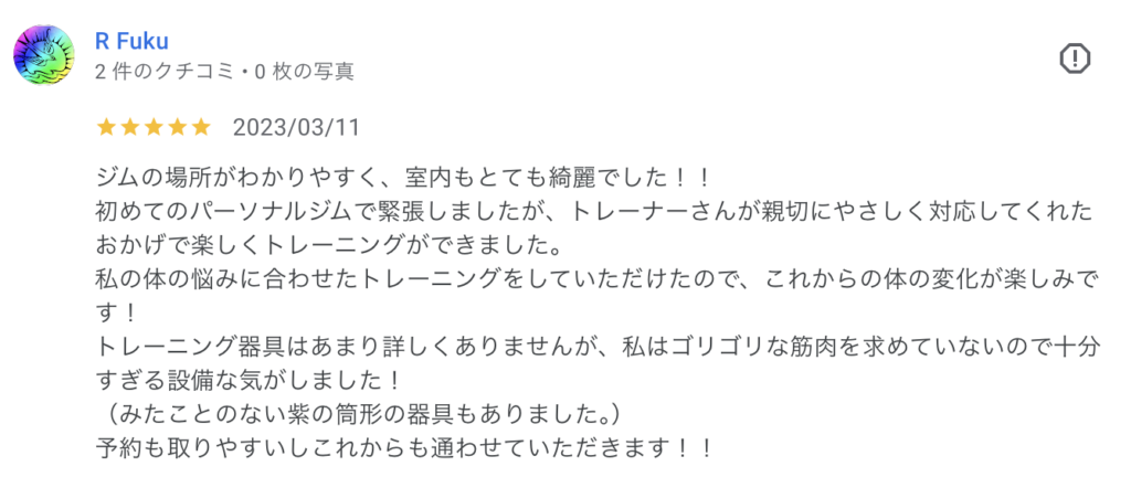 初めてのパーソナルジムで緊張しましたが、トレーナーさんが親切にやさしく対応してくれたおかげで楽しくトレーニングができました。