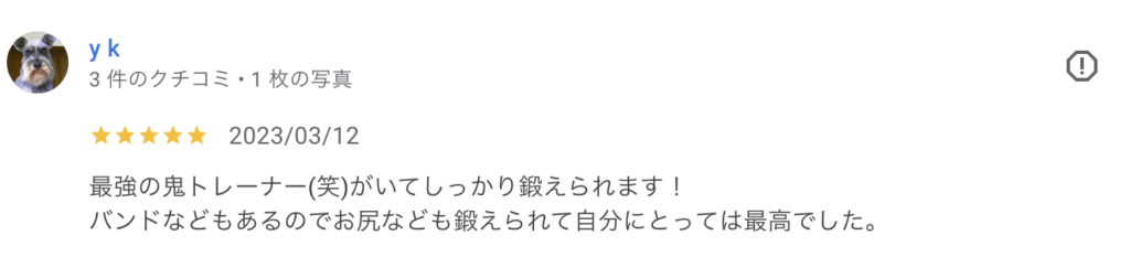 2026.02.03 バンドなどもあるのでお尻なども鍛えられて自分にとっては最高でした。y k様 口コミ 最強の鬼トレーナー(笑)がいてしっかり鍛えられます!バンドなどもあるのでお尻なども鍛えられて自分にとっては最高でした。yk様より 執筆者:sho.yamazaki TOPページ 口コミ 関連記事 2026.02.03 私の体の悩みに合わせたトレーニングをしていただけたので、これからの体の変化が楽しみです!R Fuku様 2026.02.03 骨盤矯正とトレーニングがセットになっていてとても満足する事が出来ました。takafumi様 2026.02.01 身体の事についてわかりやすく説明して頂き、体験に行ってよかったと思いました。まる様 2026.01.31 とっても楽しくトレーニングをさせてもらっています。TM様 2026.02.01 このジムは個人的に本当に続けられる!と想えるおすすめジムです。広沢忍様 2026.02.02 自分に合ったトレーニングを知りたいという方におすすめです!y様