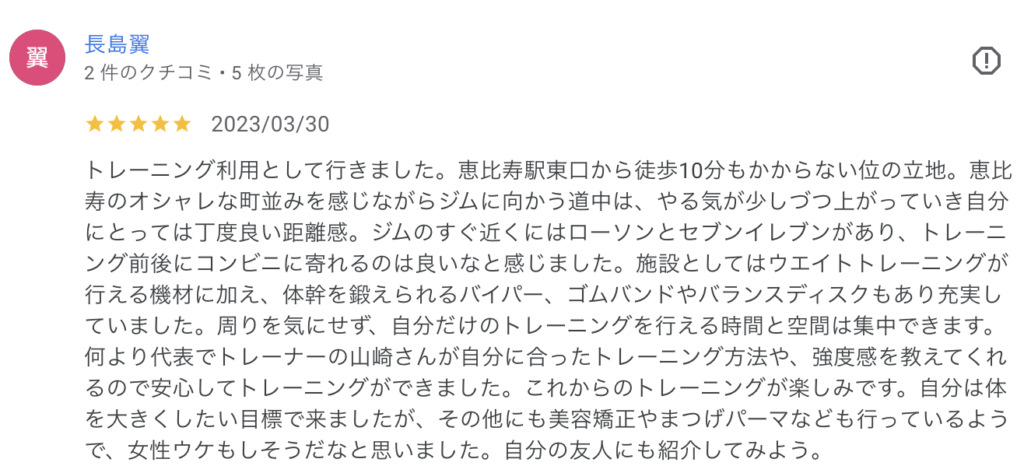 トレーニング利用として行きました。恵比寿駅東口から徒歩10分もかからない位の立地。恵比寿のオシャレな町並みを感じながらジムに向かう道中は、やる気が少しづつ上がっていき自分にとっては丁度良い距離感。ジムのすぐ近くにはローソンとセブンイレブンがあり、トレーニング前後にコンビニに寄れるのは良いなと感じました。施設としてはウエイトトレーニングが行える機材に加え、体幹を鍛えられるバイパー、ゴムバンドやバランスディスクもあり充実していました。周りを気にせず、自分だけのトレーニングを行える時間と空間は集中できます。何より代表でトレーナーの山崎さんが自分に合ったトレーニング方法や、強度感を教えてくれるので安心してトレーニングができました。これからのトレーニングが楽しみです。自分は体を大きくしたい目標で来ましたが、その他にも美容矯正やまつげパーマなども行っているようで、女性ウケもしそうだなと思いました。自分の友人にも紹介してみよう。