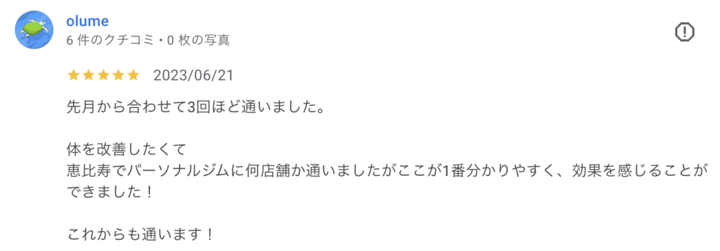 2026.02.06 恵比寿でパーソナルジムに何店舗か通いましたがここが1番分かりやすく、効果を感じることができました!olume様 口コミ 先月から合わせて3回ほど通いました。 体を改善したくて恵比寿でパーソナルジムに何店舗か通いましたがここが1番分かりやすく、効果を感じることができました! これからも通います! olume様より 執筆者:sho.yamazaki TOPページ 口コミ 関連記事 2026.02.04 満足度が非常に高いので、引き続き通ってさらに成果を出していきたいと思います。中村和矢様 2026.02.06 状態を見て都度必要なトレーニングを提示してもらえるので無理なく続けることができています。翔太斉藤様 2026.02.03 店内は広々としており色々な動きができます。平野兵悟様 2026.02.06 運動嫌いの私でも続けられそうです。横山大輝様 2026.02.02 自分に合ったトレーニングを知りたいという方におすすめです!y様 2026.02.04 身体の変化もすぐに感じられました!Fuseki Yuri様
