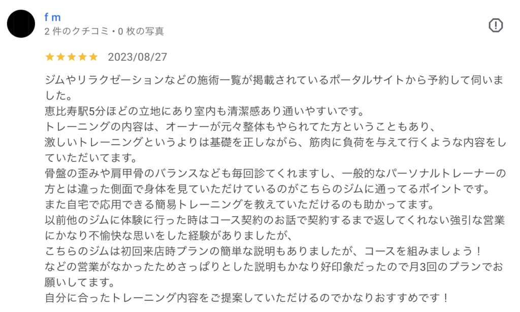 以前他のジムに体験に行った時はコース契約のお話で契約するまで返してくれない強引な営業にかなり不愉快な思いをした経験がありましたが、