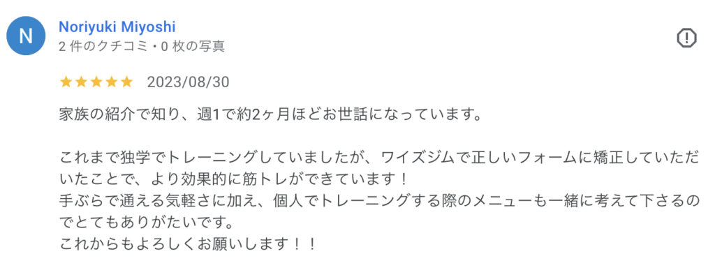 これまで独学でトレーニングしていましたが、ワイズジムで正しいフォームに矯正していただいたことで、より効果的に筋トレができています!