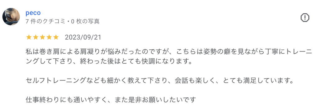 2026.02.09 姿勢の癖を見ながら丁寧にトレーニングして下さり、終わった後はとても快調になります。peco様 口コミ 私は巻き肩による肩凝りが悩みだったのですが、こちらは姿勢の癖を見ながら丁寧にトレーニングして下さり、終わった後はとても快調になります。 セルフトレーニングなども細かく教えて下さり、会話も楽しく、とても満足しています。 仕事終わりにも通いやすく、また是非お願いしたいですpeco様より 執筆者:sho.yamazaki TOPページ 口コミ 関連記事 2026.02.05 初心者にも優しく丁寧に教えてくれるジムです。ずあ様 2026.02.01 身体の事についてわかりやすく説明して頂き、体験に行ってよかったと思いました。まる様 2026.01.31 とっても楽しくトレーニングをさせてもらっています。TM様 2026.02.03 店内は広々としており色々な動きができます。平野兵悟様 2026.02.04 満足度が非常に高いので、引き続き通ってさらに成果を出していきたいと思います。中村和矢様 2026.02.01 このジムは個人的に本当に続けられる!と想えるおすすめジムです。広沢忍様