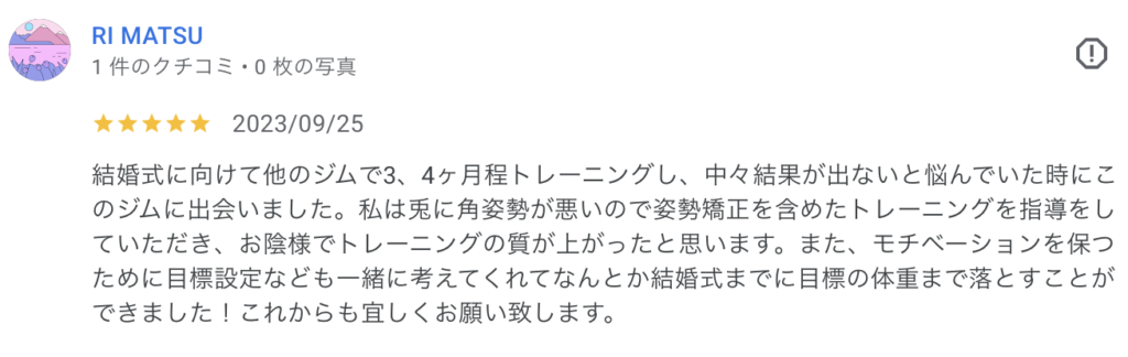 2026.02.09 結婚式までに目標の体重まで落とすことができました!RI MATSU様 口コミ 結婚式に向けて他のジムで3、4ヶ月程トレーニングし、中々結果が出ないと悩んでいた時にこのジムに出会いました。私は兎に角姿勢が悪いので姿勢矯正を含めたトレーニングを指導をしていただき、お陰様でトレーニングの質が上がったと思います。また、モチベーションを保つために目標設定なども一緒に考えてくれてなんとか結婚式までに目標の体重まで落とすことができました!これからも宜しくお願い致します。 RI MATSU様より 執筆者:sho.yamazaki TOPページ 口コミ 関連記事 2026.02.05 初心者にも優しく丁寧に教えてくれるジムです。ずあ様 2026.02.04 満足度が非常に高いので、引き続き通ってさらに成果を出していきたいと思います。中村和矢様 2026.02.04 初めてのパーソナルジムで選んで良かったです😊NS様 2026.02.05 とても楽しく満足度が高いジムでした。Yuki Okamoto様 2026.02.08 正しいフォームに矯正していただいたことで、より効果的に筋トレができています!Noriyuki Miyoshi様 2026.02.06 姿勢評価などもしてくれて勉強になりました!ken様
