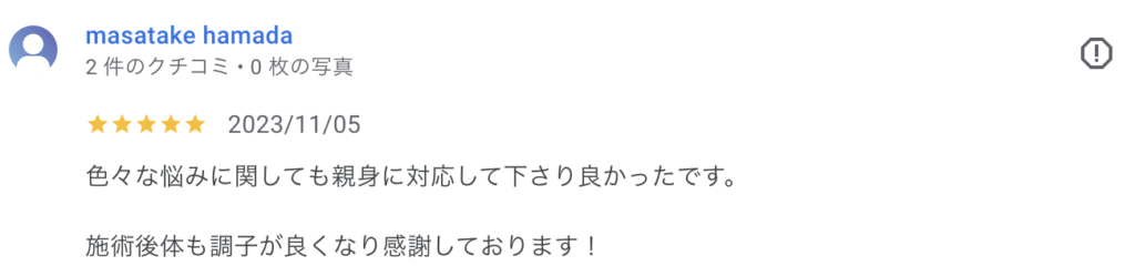 2026.02.10 色々な悩みに関しても親身に対応して下さり良かったです。masatake hamada様 口コミ 色々な悩みに関しても親身に対応して下さり良かったです。 施術後体も調子が良くなり感謝しております! masatake hamada様より 執筆者:sho.yamazaki TOPページ 口コミ 関連記事 2026.02.06 状態を見て都度必要なトレーニングを提示してもらえるので無理なく続けることができています。翔太斉藤様 2026.02.01 このジムは個人的に本当に続けられる!と想えるおすすめジムです。広沢忍様 2026.02.10 筋トレを始めるなら絶対ここ。能村和徳様 2026.02.05 とても楽しく満足度が高いジムでした。Yuki Okamoto様 2026.02.01 身体の事についてわかりやすく説明して頂き、体験に行ってよかったと思いました。まる様 2026.02.05 一度勇気を出して受講してみることをお勧めします!川島聡子様