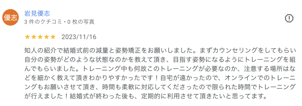 知人の紹介で結婚式前の減量と姿勢矯正をお願いしました。まずカウンセリングをしてもらい自分の姿勢がどのような状態なのかを教えて頂き、目指す姿勢になるようにトレーニングを組んでもらいました。トレーニング中も何故このトレーニングが必要なのか、注意する場所はなどを細かく教えて頂きわかりやすかったです!自宅が遠かったので、オンラインでのトレーニングもお願いさせて頂き、時間も柔軟に対応してくださったので限られた時間でトレーニングが行えました!結婚式が終わった後も、定期的に利用させて頂きたいと思ってます。