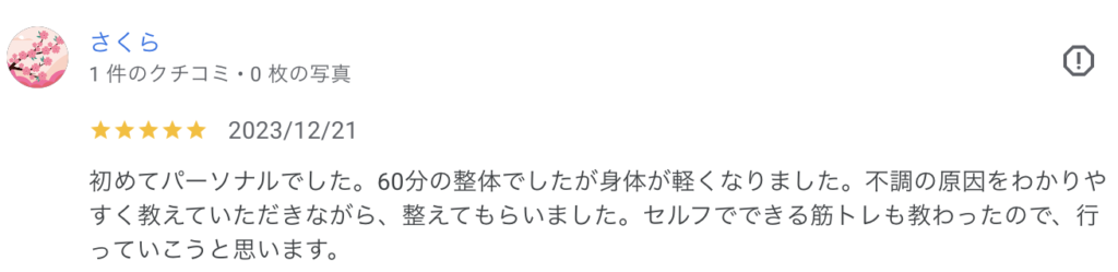 2026.02.22 初めてパーソナルでした。さくら様 口コミ 初めてパーソナルでした。60分の整体でしたが身体が軽くなりました。不調の原因をわかりやすく教えていただきながら、整えてもらいました。セルフでできる筋トレも教わったので、行っていこうと思います。さくら様より 執筆者:sho.yamazaki TOPページ 口コミ 関連記事 2026.02.09 結婚式までに目標の体重まで落とすことができました!RI MATSU様 2026.02.04 トレーナーも親切で丁寧に対応してくださいました!佐々木航弥様 2026.02.11 的確なアドバイス・改善策を教えてくれ、とても頼もしく、嬉しかったです。鈴木恭平様 2026.02.11 目指す姿勢になるようにトレーニングを組んでもらいました。岩見優志様 2026.02.08 自宅で応用できる簡易トレーニングを教えていただけるのも助かってます。f m様 2026.02.08 正しいフォームに矯正していただいたことで、より効果的に筋トレができています!Noriyuki Miyoshi様
