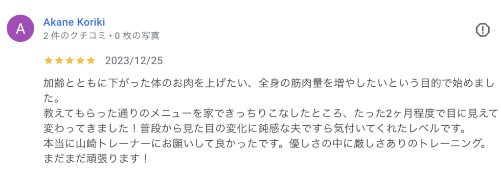 2026.02.22 加齢とともに下がった体のお肉を上げたい、全身の筋肉量を増やしたいという目的で始めました。Akane Koriki様 口コミ 加齢とともに下がった体のお肉を上げたい、全身の筋肉量を増やしたいという目的で始めました。教えてもらった通りのメニューを家できっちりこなしたところ、たった2ヶ月程度で目に見えて変わってきました!普段から見た目の変化に鈍感な夫ですら気付いてくれたレベルです。本当に山崎トレーナーにお願いして良かったです。優しさの中に厳しさありのトレーニング。まだまだ頑張ります! Akane Koriki様より 執筆者:sho.yamazaki TOPページ 口コミ 関連記事 2026.02.06 どうすれば綺麗に見えるか?などを考えて提案してくれるので、とても満足しています。澤田ひろみ様 2026.02.11 ジムに通い始めて、体重や体脂肪が少しずつ減っていくのが楽しいです!meme megu様 2026.02.09 恵比寿から近くとても通いやすいです!K W様 2026.02.04 とても落ち着いた雰囲気の場所でリラックスしながら施術していただけて良かったです😊👍🏻💕廣野峰子様 2026.02.04 バリエーションが多く、トレーニングをしていてとても楽しいです!st様 2026.02.11 目指す姿勢になるようにトレーニングを組んでもらいました。岩見優志様