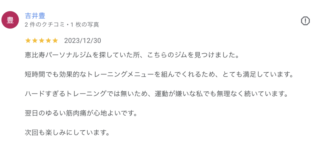 2026.02.28 ハードすぎるトレーニングでは無いため、運動が嫌いな私でも無理なく続いています。吉井豊様 口コミ 恵比寿パーソナルジムを探していた所、こちらのジムを見つけました。 短時間でも効果的なトレーニングメニューを組んでくれるため、とても満足しています。 ハードすぎるトレーニングでは無いため、運動が嫌いな私でも無理なく続いています。 翌日のゆるい筋肉痛が心地よいです。 次回も楽しみにしています。吉井豊様より 執筆者:sho.yamazaki TOPページ 口コミ 関連記事 2026.02.09 結婚式までに目標の体重まで落とすことができました!RI MATSU様 2026.02.10 診断が的確で、受けていて納得感がありました❗かわせ様 2026.02.22 初めてパーソナルでした。さくら様 2026.02.24 体験レッスン受けて良かったです!AK様 2026.02.05 ゴリゴリマッチョのストイックスタイルのジムは苦手なので、ここを見つけられて本当によかったです。M M様 2026.02.10 その日の体の声を聞きメニューを臨機応変に決めてくれる。Hisako .K様