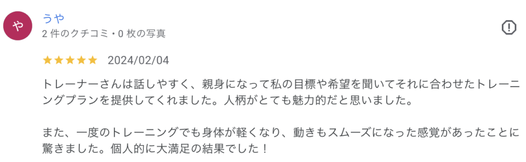2026.03.25 個人的に大満足の結果でした!うや様 口コミ トレーナーさんは話しやすく、親身になって私の目標や希望を聞いてそれに合わせたトレーニングプランを提供してくれました。人柄がとても魅力的だと思いました。 また、一度のトレーニングでも身体が軽くなり、動きもスムーズになった感覚があったことに驚きました。個人的に大満足の結果でした! うや様より 執筆者:sho.yamazaki TOPページ 口コミ 関連記事 2026.03.25 骨盤の方の根本原因を見つけてもらいすごく楽にしてもらいました。重富裕雄様 2026.02.11 的確なアドバイス・改善策を教えてくれ、とても頼もしく、嬉しかったです。鈴木恭平様 2026.02.03 店内は広々としており色々な動きができます。平野兵悟様 2026.02.04 周りを気にせず、自分だけのトレーニングを行える時間と空間は集中できます。長島翼様 2026.02.28 悩んでいた巻き肩・肩凝りが解消され、姿勢が改善されました。natsumi k様 2026.03.03 とても親切に施術して頂きました。黒岩由佳子様