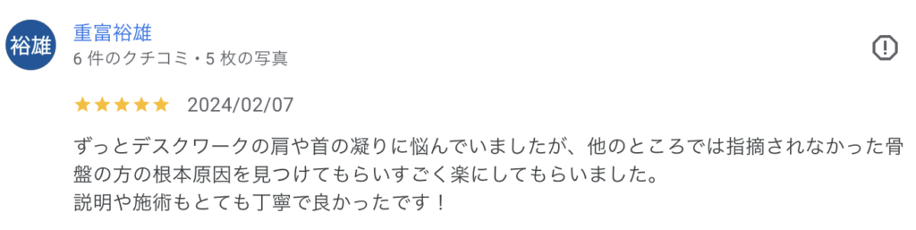 2026.03.25 骨盤の方の根本原因を見つけてもらいすごく楽にしてもらいました。重富裕雄様 口コミ ずっとデスクワークの肩や首の凝りに悩んでいましたが、他のところでは指摘されなかった骨盤の方の根本原因を見つけてもらいすごく楽にしてもらいました。説明や施術もとても丁寧で良かったです!重富裕雄様より 執筆者:sho.yamazaki TOPページ 口コミ 関連記事 2026.02.03 店内は広々としており色々な動きができます。平野兵悟様 2026.02.03 私の体の悩みに合わせたトレーニングをしていただけたので、これからの体の変化が楽しみです!R Fuku様 2026.02.01 このジムは個人的に本当に続けられる!と想えるおすすめジムです。広沢忍様 2026.02.04 とても落ち着いた雰囲気の場所でリラックスしながら施術していただけて良かったです😊👍🏻💕廣野峰子様 2026.02.10 その日の体の声を聞きメニューを臨機応変に決めてくれる。Hisako .K様 2026.03.04 パーソナルトレーニングは初めてでしたが、とても丁寧なカウンセリングで緊張も解け、リラックスする事ができました。平山明佳様