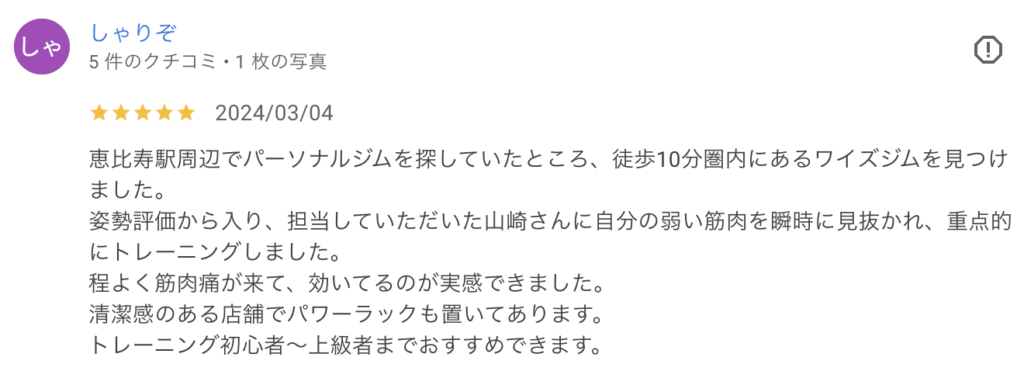 2026.04.05 トレーニング初心者〜上級者までおすすめできます。しゃりぞ様 口コミ 恵比寿駅周辺でパーソナルジムを探していたところ、徒歩10分圏内にあるワイズジムを見つけました。姿勢評価から入り、担当していただいた山崎さんに自分の弱い筋肉を瞬時に見抜かれ、重点的にトレーニングしました。程よく筋肉痛が来て、効いてるのが実感できました。清潔感のある店舗でパワーラックも置いてあります。トレーニング初心者〜上級者までおすすめできます。 しゃりぞ様より 執筆者:sho.yamazaki TOPページ 口コミ 関連記事 2026.02.06 自宅でできるトレーニングなども指導してくれるので、運動習慣のない私にはとても助かっています。堀合えみ子様 2026.02.10 運動が嫌いだった私でも、楽しく通えています。Ami様 2026.03.03 何より筋トレ・運動が好きになりました!佐藤智美様 2026.02.22 施術後は緩和され身体がとても楽になりました。馬屋原由佳様 2026.02.05 その日の体調に合わせてトレーニングを作成してくれます。K様 2026.02.06 恵比寿でパーソナルジムに何店舗か通いましたがここが1番分かりやすく、効果を感じることができました!olume様