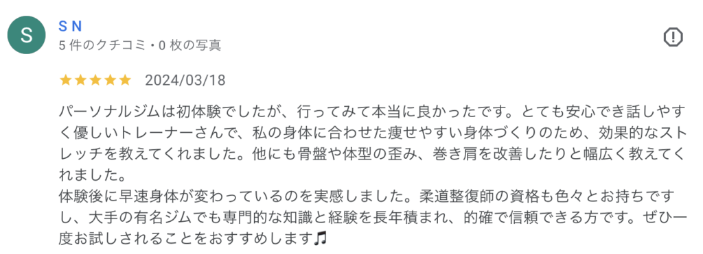 2026.04.21 骨盤や体型の歪み、巻き肩を改善したりと幅広く教えてくれました。S N様 口コミ パーソナルジムは初体験でしたが、行ってみて本当に良かったです。とても安心でき話しやすく優しいトレーナーさんで、私の身体に合わせた痩せやすい身体づくりのため、効果的なストレッチを教えてくれました。他にも骨盤や体型の歪み、巻き肩を改善したりと幅広く教えてくれました。体験後に早速身体が変わっているのを実感しました。柔道整復師の資格も色々とお持ちですし、大手の有名ジムでも専門的な知識と経験を長年積まれ、的確で信頼できる方です。ぜひ一度お試しされることをおすすめします🎵 S N様より 執筆者:sho.yamazaki TOPページ 口コミ 関連記事 2026.02.04 とても落ち着いた雰囲気の場所でリラックスしながら施術していただけて良かったです😊👍🏻💕廣野峰子様 2026.03.09 ムキムキになりたいわけではない女性が通いやすいと思いました。Ay En様 2026.03.25 骨盤の方の根本原因を見つけてもらいすごく楽にしてもらいました。重富裕雄様 2026.02.05 初心者にも優しく丁寧に教えてくれるジムです。ずあ様 2026.02.05 その日の体調に合わせてトレーニングを作成してくれます。K様 2026.03.25 トレーナーさんのお人柄がとっても素敵なジムです!k y様