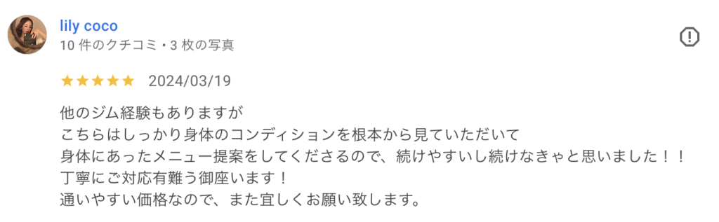 2026.04.21 身体にあったメニュー提案をしてくださるので、続けやすいし続けなきゃと思いました!!lily coco様 口コミ 他のジム経験もありますがこちらはしっかり身体のコンディションを根本から見ていただいて身体にあったメニュー提案をしてくださるので、続けやすいし続けなきゃと思いました!!丁寧にご対応有難う御座います!通いやすい価格なので、また宜しくお願い致します。 lily coco様より 執筆者:sho.yamazaki TOPページ 口コミ 関連記事 2026.03.27 私にあった無理のないトレーニングを楽しくできました。中野由香様 2026.02.05 一度勇気を出して受講してみることをお勧めします!川島聡子様 2026.03.04 身体の癖を把握した上での的確な施術とアドバイスが大変気に入りました。まゆ様 2026.03.03 1人だと続けることが難しい人にはオススメです。山辺孝様 2026.02.24 体験レッスン受けて良かったです!AK様 2026.04.14 辛い思いをせずに、楽しく成果を出したい方。ぜひおすすめですー!tomoko fukumoto様