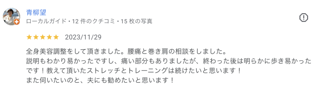 初めてパーソナルでした。60分の整体でしたが身体が軽くなりました。不調の原因をわかりやすく教えていただきながら、整えてもらいました。セルフでできる筋トレも教わったので、行っていこうと思います。