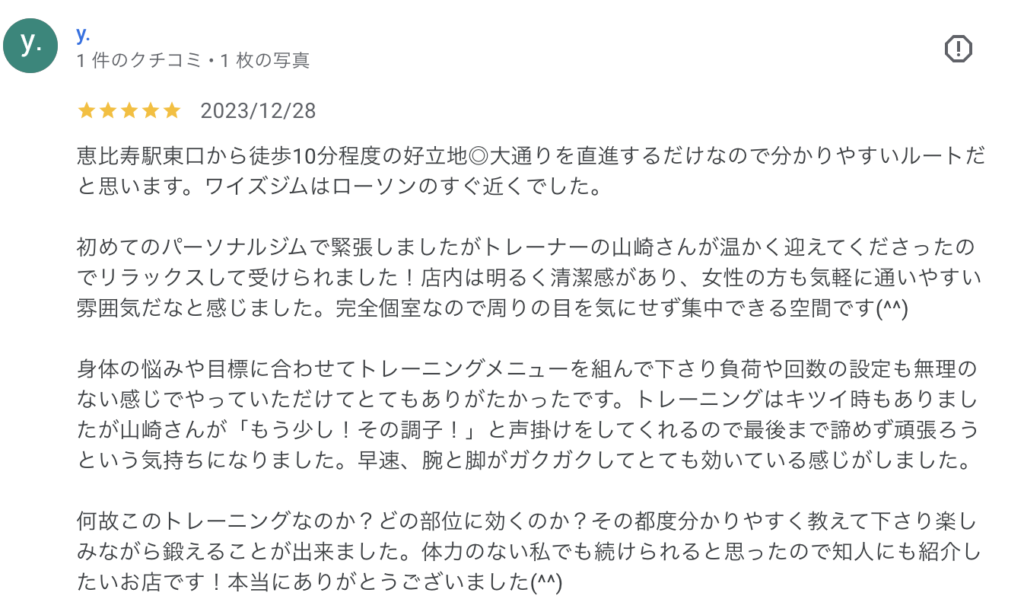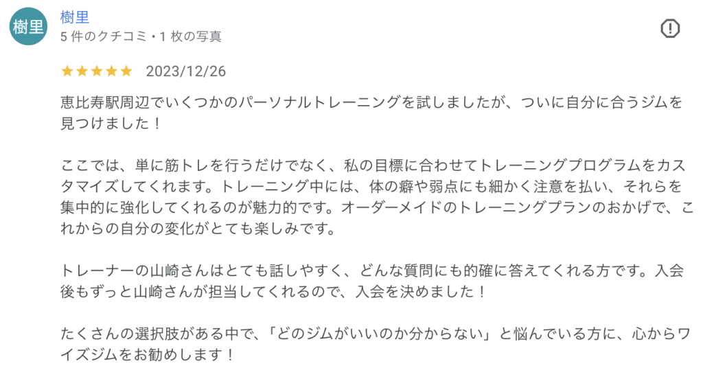 トレーナーの山崎さんはとても話しやすく、どんな質問にも的確に答えてくれる方です。入会後もずっと山崎さんが担当してくれるので、入会を決めました!