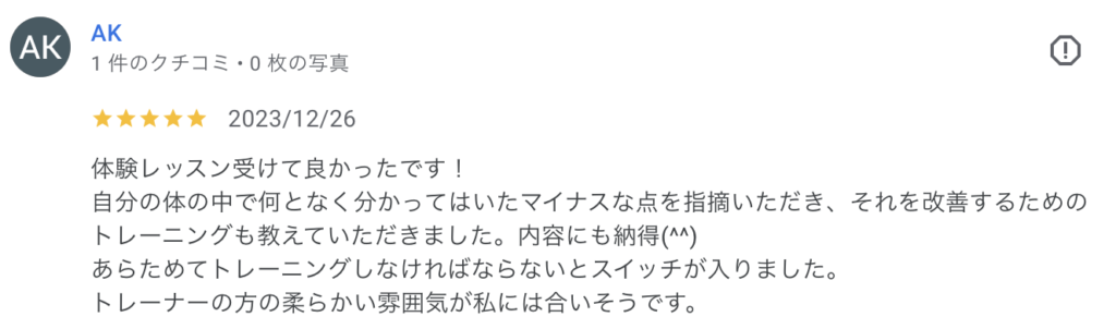 自分の体の中で何となく分かってはいたマイナスな点を指摘いただき、それを改善するためのトレーニングも教えていただきました。内容にも納得(^^)